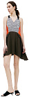 Платье Damir Doma сшито из разных по цвету и фактуре тканей. Верх из черно-белого фактурного материала с оранжевой сеткой, асимметричный подол из легкой ткани дополнен карманами.